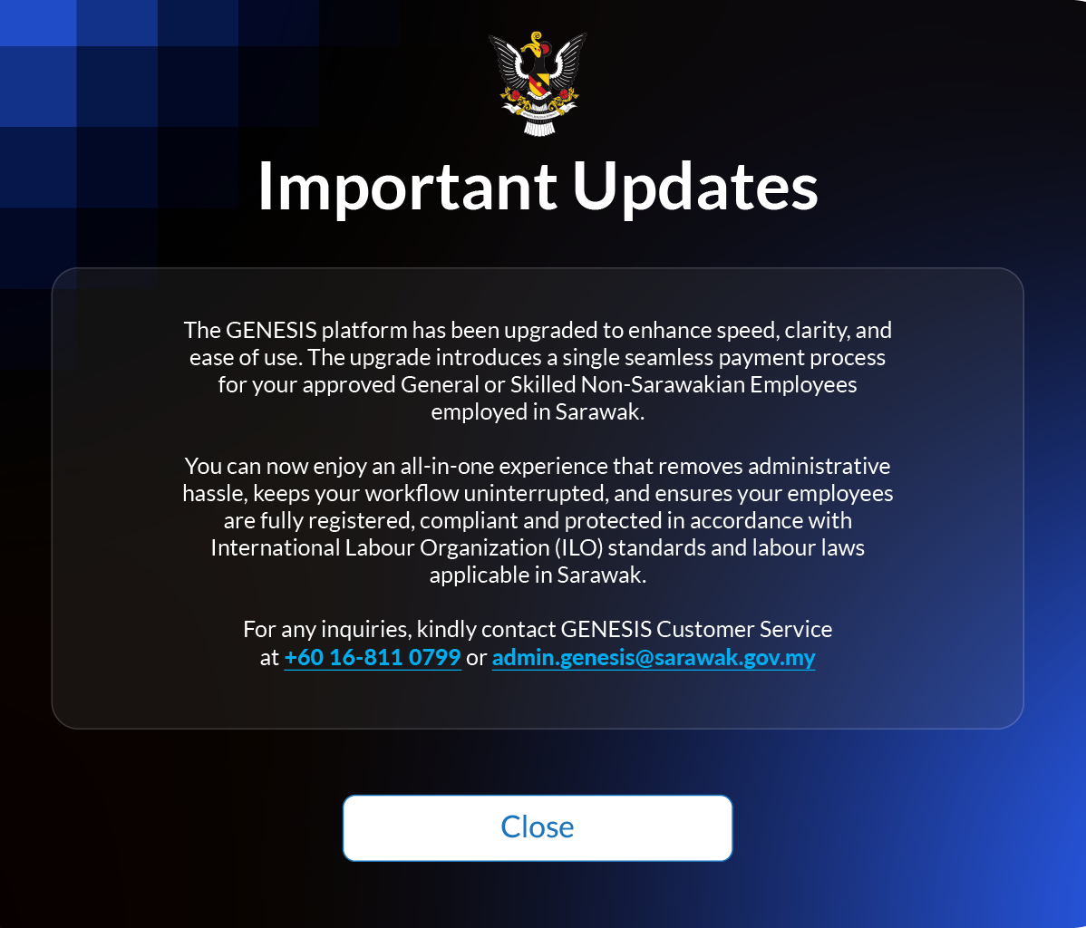 PLEASE READ THIS USER AGREEMENT CAREFULLY BEFORE USING THE Gateway and Employment for Non-Sarawakians via Sarawak’s Integrated System (hereinafter referred to as “GENESIS system”). BY USING THE GENESIS SYSTEM, YOU ARE AGREEING TO BE BOUND BY THE TERMS OF THE GENESIS SYSTEM. IF YOU DO NOT AGREE TO THE TERMS, DO NOT USE THE GENESIS SYSTEM.
